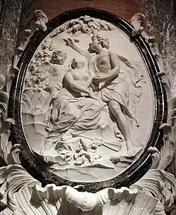 Various reliefs by Xavery have been preserved. The marble relief with an allegorical representation under the organ of the Grote Kerk in Haarlem is considered one of his best works. He also made many chimney pieces, only a few of which have survived. In the salon of Huis Dedel in The Hague (now Design Museum Dedel) there was a marble chimney piece with two girls' heads that was probably made by Xavery.[5] One of his chimney pieces made for the residence in The Hague of Diederik Baron van Leyden is now in the Rijksmuseum in Amsterdam. He designed the fireplace and the chimney piece, which is a relief representing the mythological lovers Paris and Oenone. Paris is shown engraving the name of his beloved on a tree. There are two drawings by his friend and frequent collaborator Jacob de Wit that probably served as designs or sources of inspiration for the relief. De Wit's artistic influence on Xavery sheds an interesting light on their working relationship in Leiden.[10]