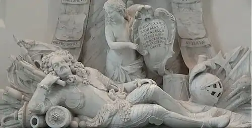 Xavery made several bust portraits. One impressive work is the marble bust of Don Luis da Cunha, ambassador of Portugal (1737, Rijksmuseum). Don Luis da Cunha (1662–1749) was ambassador to the kingdom of Portugal between 1728 and 1736. The bust shows the ambassador as a stately figure wearing a cuirass and cloak. Even though the sitter was already 75 years old at the time of the bust, Xavery gave him a vital face. This was likely the result of the artist not dwelling on the details in the face and clothing of the ambassador. Xavery made bust portraits of other prominent personalities such as William VIII, Landgrave of Hesse-Kassel, Frederick I of Sweden, the Duke of Marlborough and Prince Eugene of Savoy.[14] Xavery also made a portrait bust of François Fagel, an important personality who served as servant of the States General for more than sixty years.[3] His various funeral monuments also include busts or full-length portraits of the deceased persons. These include the funeral monuments of Johannes Graaf von Lilljenstedt (1732) in the Marienkirche in Stralsund, Johan Theodorus baron von Friesheim (1733) in the Grote of Sint-Catharinakerk in Heusden, Sicco van Goslinga (1737) in the Hervormde kerk in Dongjum and Count Oswald III van den Bergh (1741) in the Sint Petrusbasiliek in Boxmeer. Some of the funeral monuments such as that of Reinhart Vincent von Hompesch in Linnich have been lost while of that of Johan van Welderen only the bust portrait has survived.[5]