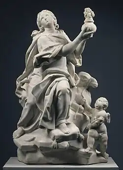 De Cock worked in many materials including marble, stone, bronze, wood and terracotta.[10] His style shows the influence of the late Baroque works produced by the workshop of his master Verbrugghen. He also admired sculpture from the Antique and the work of his compatriots François Duquesnoy and Artus Quellinus the Elder.[17] This is reflected in the tendency towards Classicism in his work.[4] He is known for his allegorical representations of children. An example are a pair of terracotta figures representing Air and Fire. The Africa boy stands for the element Fire because of the association of black people with the heat of the African sun.[18] The statues may also be allegorical representations of the continents Europe and Africa. They were likely created as workshop models for larger stone and marble compositions. These terracotta models appealed as individual works of art and were collected by contemporary collectors.[19] Among his allegorical representations of children are a few busts and statues of African boys, such as the African boy with a crown in the form of a fortress (1704, Rijksmuseum in Amsterdam),[20] the marble Bust of a black boy (1705–10, Victoria and Albert Museum)[15] and the bronze Bust of an African Boy (Walters Museum). There have also been a number of similar busts attributed to de Cock sold on the art market. These busts may have been based on a particular individual but were also intended to represent a general type of the African[21] The African boys typically wear on their chest a medallion, showing a portrait or a symbol. These were likely connected with the particular preference of the patron for whom the sculpture was produced. For instance, the medallion on the bust in the Victoria and Albert Museum represents a cardinal's hat. This suggests that the boy represented a cleric's page and that the bust was likely commissioned by a cardinal.[22]