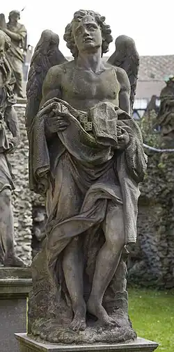Many of de Cock's commissions were for church furniture and decoration as well as tomb monuments. He made in 1713 Caryatids for the choir stalls of the former priory of Corsendonk in Oud-Turnhout, today partially displayed in the collegiate St. Peter's Church in Turnhout.[28] They are the most striking example of the classicist streak in de Cock's work. He was able to incorporate his medallions and caryatids into the back panel in a soberly harmonious manner, so that the balance between architecture and sculpture was restored. Some of the elegant figures in the choir stall are executed in the late Baroque style, others in a restrained classical manner.[29] De Cock was one of the artists who worked on the creation of a group of statues referred to as the Calvary on the outside of the St. Paul's Church in Antwerp. Its overall design dates from 1697. In 1734 construction of the Calvary was completed but further statues were added up to 1747. It is built as a courtyard and leans on one side against the south aisle of the church and the Chapel of the Holy Sacrament. The structure includes 63 life-size statues and nine reliefs executed in a popular and theatrical style. The statues are arranged into four groups: the angel path, which ascends to the Holy Sepulcher, the garden of the prophets on the left, the garden of the evangelists on the right and the Calvary itself, which consists of an elevated artificial rock, divided into three terraces, on which statues are placed with Christ on the cross at the top.[30] Most statues are of white stone with some made of wood. Some statues are dated or signed. The principal sculptors were de Cock, Michiel van der Voort the Elder and Alexander van Papenhoven with some statues by the hand of Jan Pieter van Baurscheit de Elder, Willem Kerricx and his son Willem Ignatius Kerricx and anonymous collaborators. De Cock also sculpted a number of the statues, 12 of which are signed and 5 of which are attributions. These include various angels carrying symbols of Christ's Passion, various biblical figures as well as a penitent Maria Magdalen.[31][32]