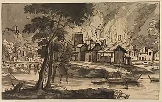 - ^ Jan Claudius de Cock, Brennende Stadt an einem Fluss at the Kupferstichkabinett, Herzog Anton Ulrich Museum (in German)