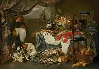 He was the first artist to depict game as a subject of hunting rather than as food displayed in a home or kitchen. He did not place fruit and vegetables in his game pieces but rather dogs forming part of the hunting scene in an outdoor landscape.[3] As the game was no longer shown as food but as a trophy, these works have been referred to as trophy pieces. This new approach to the display of game as part of the hunt caused Fyt to include hunting equipment and tools in these works.[12] Hounds play an important role in these pieces and together with the hunting equipment they point to the proximity of the master. Fyt occasionally included portraits of individuals and families in these game pieces.[3] While hunting was at the time still a pastime reserved for the aristocracy, the well-off urban elite were eager to acquire Fyt's game pieces to decorate their houses with these tokens of a lifestyle only open to aristocrats.[13]