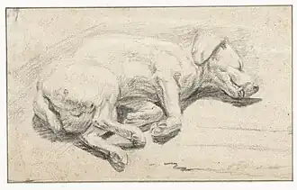 Fyt was an accomplished etcher and he produced a series of etchings depicting mainly animals and dogs. These were published in his lifetime in two sets referred to respectively as the Set of the Dogs and the Set of the Animals. The set of 8 prints of the Dogs series was published in 1642. The title plate shows two hunting dogs in front of a pedestal with a dedication to the Spanish Don Carlo Guasco, Marquess of Soleno who was the patron of the publication. The other plates show dogs in the middle of various activities and situations.[16]