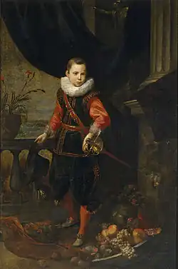 In addition to the work he produced as an independent artist, he collaborated with other artists. He is known to have collaborated regularly with Anthony van Dyck during the two periods that van Dyck stayed in Genoa (1621 and 1625–1627).[6] Some see the brush of Roos in the still lifes that appear in van Dyck's Vertumnus and Pomona[7] and in Diana and Endymion.[8] The style of van Dyck influenced Roos' work as can be seen in the Portrait of a boy, now in the Museo del Prado. Some of Roos' works such as The holy family (Parochial church of Moltedo, Imperia) have in the past been attributed to van Dyck.[9]