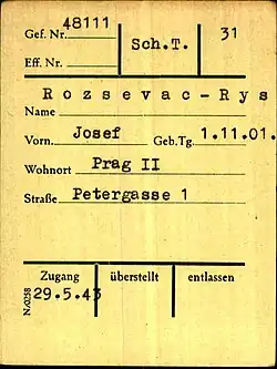 Rys-Rozsévač attempted to establish a mass fascist organization and helped to move Vlajka from traditional anti-German chauvinism to collaboration with Nazis and Gestapo. During 1939 - 1940 Vlajka organized mass meetings against politicians of the First Republic of Czechoslovakia as represented by Masaryk and Beneš. The German occupational authorities nevertheless decided to support a group of collaborators around Emanuel Moravec, his political competitor. Because of constant propaganda attacks on Moravec, Vlajka was disbanded at the end of 1942 and the leaders, including Rys-Rozsévač, were sent as privileged prisoners into the Dachau concentration camp and transferred to Tyrol at the end of the war, where he was liberated in early May 1945.[1] After the war Rys-Rozsévač and three his coworkers (Josef Burda, Jaroslav Čermák and Otakar Polívka) were sentenced to death, and several others to were sentenced to long term imprisonment. Rys-Rozsévač was hanged in Pankrác Prison in 1946.