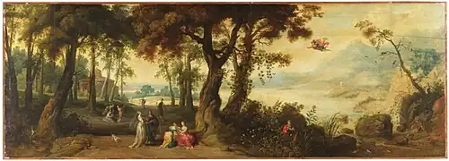 In Italy Wildens discovered the landscape art of his compatriot Paul Bril with its realism and eye for detail.[1] Upon his return to Antwerp, Wildens became a frequent collaborator with Rubens. He was responsible for the landscape backgrounds of various scenes in the designs of Rubens for the Decius Mus tapestry series and many history paintings by Rubens, including The Rape of the Daughters of Leucippus (c. 1618; Alte Pinakothek, Munich), Samson and the Lion (c. 1618; Private Collection), Cimon and Iphigenia (c. 1617–18; Kunsthistorisches Museum, Vienna) and Diana and her Nymphs Departing for the Chase (c. 1616; Cleveland Museum of Art).[6][7]