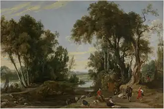 Jan Wildens (1586 in Antwerp – 16 October 1653 in Antwerp) was a Flemish painter and draughtsman specializing in landscapes. His Realist landscapes show an eye for detail and have a serene character. He was a regular collaborator with Rubens and other leading Flemish Baroque painters of his generation in whose compositions he painted the landscapes.[1]