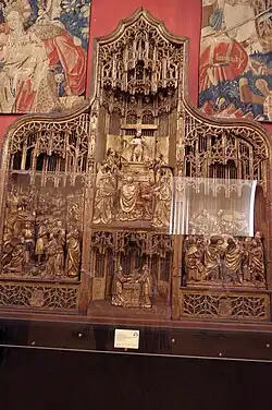 Other characteristics are visible in a polyptych in the collection of the National Museum in Warsaw - so-called Saint Reinhold Altar.[5] 10 scenes from the life of Mary arranged in 2 rows with additional 4 sections with figures of Saints were crowned by architectural decorations in the form of curved tracery. The top of the retable in variety of curves and accolades, as well as disproportionality of figures are other features of de Molder's style. Oak wood, used for production, was covered with a coating of gesso (size and chalk) over which gold leaf and colour were laid.[5] The polyptych was commissioned by Brotherhood of Saint Reinhold in Gdańsk and created before 1516 in cooperation with Joos van Cleve who painted the side wings.[5]