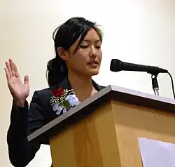 In 2003 while campaigning for Green Party mayoral candidate Matt Gonzalez, Kim observed that Asian Americans were not well represented in San Francisco politics despite the size of its population. In 2004, she decided to run for the San Francisco Board of Education. In a field of 12 candidates seeking four seats, Kim came in seventh place; her bid failed in part because she was a member of the minority Green Party and did not have the backing of the Democratic Party.[12] In 2006, Kim mounted a stronger campaign and she came in first in a field of 15 candidates seeking three seats. Kim was the top vote getter in every district except Marina/Cow Hollow, West of Twin Peaks and Castro/Noe Valley.[12] In 2007, she became the first Korean American elected official in San Francisco.[15] Kim's election was part of a more liberal shift in the school board joining Fellow Green Mark Sanchez, Eric Mar, and Kim-Shree Maufas.[16][17]