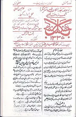 The periodical Jangal (Persian: جنگل, lit. 'Forest'; DMG: Ǧangal) was founded in 1917 by the Nehzat-e Jangal (“Jangali-movement“, 1914–1921) in Gilan, Iran.[1] Mirza Kuchak Khan (1880/1882–December 1921), a young revolutionary and the founder and leader of this movement was fighting together with the Ettehad-e Eslam committee (“Islamic Unity“) in the forests of Northern Iran. Their movement was directed against – among others – large landowners as well as the exertion of influence coming from the British and Tsarist Russia. In June 1920, the Jangalis joined forces with the Communist Party of Iran and proclaimed the Socialist Republic of Gilan, which was re-conquered by Reza Khan Pahlavi (later: Reza Shah Pahlavi) in November 1921.[2] The journal was the mouthpiece of the Jangalis and partially published by Mirza Hoseyn Kasma’i (1862–1921). They spread their opinion and critique in 31 issues by means of literary texts and cultural symbolism.[3] They had many ideas in common with the nationalism of state elites: aspiring the compatibility of Islam, Iranian nationalism and socialism.[4]