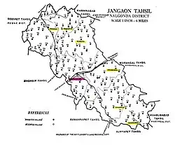 In 1854 the Jangaon area was under the administrative region of Bhonagheer Circars.[10] Jangaon is mentioned as Zungaon in an 1854 map. In 1866 new districts were created; all Circars were delimited and merged. Bhonagheer, Davercondah and Nelgoondah Circars merged to form Nalgonda District but the Jangaon area was transferred from Bhongir Circar to Warangal District in 1866, Cherial was renamed Taluka by adding some parts of Wardannapet region, with its headquarters at Jangaon.[11]