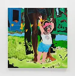 Ellis describes her paintings as, “not only an attempt to communicate to nonblack women my experience, but also to call to other black women, ‘Do you feel this, too?’”[1] Critic Rachel Corbett has commended Ellis for the psychoanalytic tension in her paintings, stating "The calm country landscapes in the background of Ellis’s paintings clash with her psychologically tormented subjects, who are often tyrannized by cartoon characters."[7] Occasionally, Ellis's paintings incorporate religious symbology; such as lambs or angels, referencing the canon of religious painting.[7] In each of her works Ellis continues to share her story incorporating different parts of her self identity. In 2017, Ellis presented "Lick Shot" at 47 Canal,[8] her first solo show in New York City. In 2018, Ellis participated in the New Museum Triennial - “Songs for Sabotage.”[7] Then in 2019 Ellis was included in the Whitney Biennial curated by Rujeko Hockley and Jane Panetta.[9] In the 2025 exhibition "Fear Corroded Ape," her work was presented at Harvard University's Carpenter Center for the Visual Arts.[10][3]