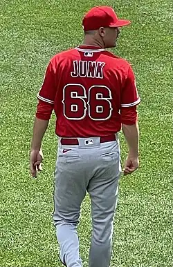 The Yankees traded Junk and Elvis Peguero to the Los Angeles Angels on July 30, 2021, in exchange for Andrew Heaney.[10] On September 3, the Angels selected Junk's contract from the Double-A Rocket City Trash Pandas and added him to their major-league roster.[11] He made his MLB debut two days later, starting against the Texas Rangers and taking the loss.[12] He allowed five runs (four earned) on six hits in 3 2+⁄3 innings and recorded two strikeouts and one walk.[13]