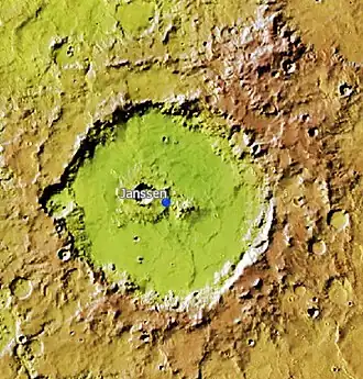 Janssen Crater is an impact crater in the Arabia quadrangle on Mars at 2.7° N and 322.4° W. and is 154 km in diameter. Its name was approved in 1973, and refers to French astronomer Pierre Janssen.[1] Some close up images of the crater reveal layers in a floor deposit. A picture below show these layers, as well as dark slope streaks. The darker the streak, the younger it is. The layers on the floor of Janssen may have been formed on the bottom of lakes.[2][3][4]