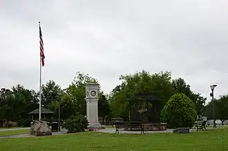 Janssen Park is a municipal park in the heart of the city of Mena, Arkansas. It is bounded by Janssen and Port Arthur Avenues, and 9th and 7th Streets. The park is a large grassy expanse with occasional mature trees, and features walkways radiating from a central drive, which circles around Mena's oldest building, the c. 1850s Shelton log cabin. A pair of ponds are located in the park's southern quadrant, and there is a clocktower within the circle near the cabin. The park was laid out in 1896, the year of the city's founding, but was not properly developed until ten years later.[2] The park was listed on the National Register of Historic Places in 1979.[1]