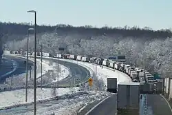 In Ellendale, Delaware, 14.5 inches (37 cm) of snow fell on 3 January.[27] This led to a chicken house collapse on 4 January which trapped and injured a 12-year-old girl.[28] Due to hazardous conditions, speed limits on parts of the Garden State Parkway and New Jersey Turnpike were reduced to 45 mph (72 km/h), while the speed limit was reduced to 35 miles per hour (56 km/h) on the Delaware Memorial Bridge.[29] Parts of U.S. Route 40 in Egg Harbor Township, New Jersey shut down due to flooding.[30] Additionally, the Atlantic City International Airport was closed for 7 hours.[31] At the airport, 13.0 inches (33 cm) of snow was recorded just 24 hours after the temperature was 62 °F (17 °C).[32] Unusually, the nor'easter struck with very little warning and produced little to no snow north of Philadelphia and Toms River, New Jersey.[33] The city of Philadelphia itself received only 1 inch (2.5 cm) of snow, much less than locations further south.[34] The result of the cutoff also resulted in South Jersey being the snowiest region of New Jersey for the 2021-22 winter, which was only the third time in history that occurrence happened.[35]