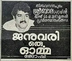 January Oru Orma (transl. January, a memory) is a 1987 Indian Malayalam-language romance film, directed by Joshiy, written by A. R. Mukesh, based on a screenplay by Kaloor Dennis. The film was produced by Tharanjini Films. The film stars Mohanlal and Karthika in the lead roles, while Suresh Gopi, M. G. Soman and Jayabharathi appear in supporting roles.[1][2] The film was a commercial success at the box office. It was declared a super hit.[3] The film has musical score by Ouseppachan.[4]