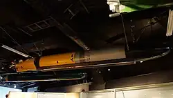 Designed 1966, in service 1972. Straight-running torpedo. Beginning in 1954, research on a high-speed straight-running torpedo was conducted; this project was codenamed G-5 and used a reciprocating kerosene-oxygen wet heater engine derived from that of the Type 93. The G-5 project resulted in a prototype with a speed in excess of 50 kn (93 km/h). In 1965, the requirements were altered and the project was redesignated G-5B.[48] The G-5B was initially projected to use ethanol as fuel and nitric acid as the oxidizer; the final version used high-test peroxide (hydrogen peroxide) as the oxidizer.[49] The exhaust consisted of water vapor and carbon dioxide, which eliminated the formation of a surface wake trail. Used on submarines such as the Uzushio class and Type 11 torpedo boats. Following the adoption of the Harpoon missile in 1980s, the non-homing Type 72 was deemed obsolescent. The first JMSDF submarine to be equipped for launch of the UGM-84 was the Nadashio (SS-577), with all subsequent submarines being likewise equipped after 1983.[50] The torpedoes were withdrawn from service in 1994 and eventually scrapped. A sectioned Type 72 is exhibited at the Sasebo Maritime Self-Defense Force Museum.[51]