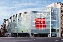 The building, built on a pre-existed building, from the Haussmann's renovation era of Paris, with a large mural dedicated to the Great Men of the 20th century painted on it.