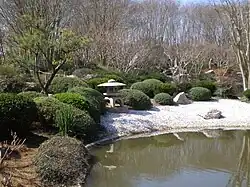 In 1990, Japanese Prime Minister Toshiki Kaifu arrived in Houston for the 16th G7 Summit. As a gesture of goodwill towards the city, he arranged for the donation of a traditional Japanese teahouse by the Japan World Exposition 1970 Commemorative Fund. Constructed in Japan with traditional materials, the teahouse was broken down and shipped to Houston, where it would be reassembled by Japanese craftsmen without use of a single nail.[2] Before the structure arrived for reassembly, Tokyo landscape architect Ken Nakajima was commissioned to plan the garden. He wrote of the project, "We must work with nature to create a new space and sense of beauty. This is the essence of the Japanese garden."[2]