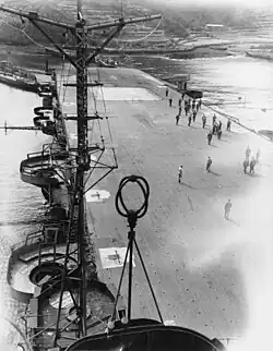 The ship's primary armament consisted of a dozen 12.7-centimetre (5 in) Type 89 dual-purpose guns in twin mounts on sponsons along the sides of the hull. Hiyō was also initially equipped with eight triple mounts for 2.5 cm Type 96 light AA guns alongside the flight deck.[9] This was the standard Japanese light AA gun during World War II, but it suffered from severe design shortcomings which rendered it a largely ineffective weapon. According to historian Mark Stille, the twin and triple mounts "lacked sufficient speed in train or elevation; the gun sights were unable to handle fast targets; the gun exhibited excessive vibration; the magazine was too small, and, finally, the gun produced excessive muzzle blast".[10] In early 1943, four more triple mounts were added, and another four triple mounts were added late in the year. Two of these last four mounts were mounted on the stern and the others were placed in front of and behind the island. A dozen single mounts were also added, some of which were portable and could be mounted on tie-down points on the flight deck.[9]
