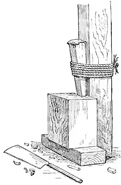 The traditional Japanese vise was a wedge of wood tied to a post with a coil of rope. The wood was inserted under the wedge and the wedge hammered down.[5]