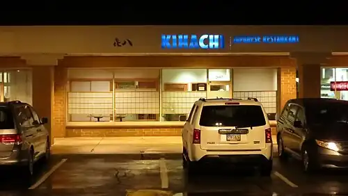 In 2011 Daley wrote that "The number of Japanese restaurants in and around Columbus ranges from 19 to at least 40, depending on who's counting, and there are dozens more if you tally restaurants under a generic "Asian" theme."[1] Daley stated that Kihachi (㐂八[9] or 喜八;[10] "㐂" means "喜" or "happy"), a restaurant in Northwest, Columbus, was "so highly regarded" to the point that it was featured in an episode of Anthony Bourdain: No Reservations.[1] In that episode, Anthony Bourdain and Michael Ruhlman visited Kihachi.[1] The restaurant closed in 2018 as the owner decided to retire.[11]
