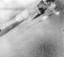 With three heavy cruisers and two destroyers out of the fight, the fleet regrouped into two circular formations, Haguro serving in the leading group centering around Yamato in anticipation of air attacks. These fears proved correct when aircraft from five American fleet carriers raided the center force in the afternoon of 24 October. Haguro came under attack several times, being strafed, but was not hit. This was because the majority of the air attacks were focused on Musashi, which over nine hours was hit by at least 17 bombs and 19-20 torpedoes, sinking by the bow that evening. Meanwhile, Myōkō was hit by an aerial torpedo which dropped her speed to 15 knots and forced her to retire, resulting in Vice Admiral Hashimoto transferring his flag to Haguro as she continued on with the fleet.[2][19]