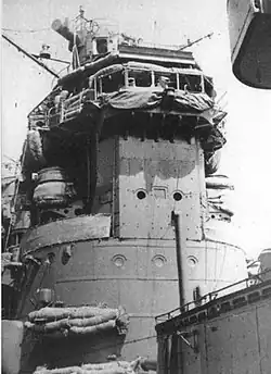 On 4 March 2003, a group of specialized shipwreck divers operating off MV Empress discovered the wreck of Haguro in 67 metres (220 ft) of water in the Malacca Strait south of Penang.[34] The wreck sits upright, covered in places by discarded trawler nets with her hull opposite her forward turrets buried in the seabed to about her original waterline, but this level gradually reduces until at the stern her outer propellers and shafts are actually up above the seabed. Her foremast and the top half of the bridge structure are missing/collapsed. Her mainmast is collapsed. Her funnels are missing. British hits are visible in places. The bow section forward of no. 2 turret is badly damaged by torpedo hits. Haguro's no. 1 turret and barbette are uprooted and lie against the hull, the rear of the turret on the starboard sea bed and the barrels pointing vertically towards the surface. Her no. 2 turret is trained to starboard at approximately the 1 o'clock position, with its roof collapsed and both barrels and breeches missing, as they were not replaced after being damaged by a bomb at the earlier Battle of Leyte Gulf. Her no. 3 turret's guns are askew and trained to the port quarter at the 8 o'clock position. Both her stern main turrets' guns point almost directly astern. Just behind the no. 5 turret, the wreck is broken in half, although the very stern section is still "partially" attached and heavily damaged on the port side.[2]