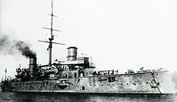 The ship's waterline armor belt had a maximum thickness of 150 millimeters (5.9 in) amidships and tapered to 70 millimeters (2.8 in) towards the ends of the ship. Between the main gun barbettes it covered the entire side of the ship up to the level of the upper deck. The ends of the central armored citadel were enclosed by transverse bulkheads 120 millimeters (4.7 in) thick. The forward barbette, the conning tower, and gun turrets were also protected by 150-millimeter armor while the aft barbette only had 100 millimeters (3.9 in) of armor. Her deck armor ranged from 20 to 40 millimeters (0.8 to 1.6 in) thick and the 6-inch guns on the upper deck were protected by gun shields.[8]