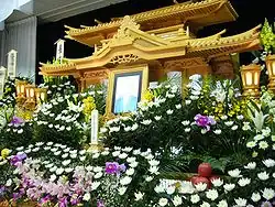 Although Japan has become a more secular society (see Religion in Japan), as of 2007, 90% of funerals are conducted as Buddhist ceremonies.[2] Immediately after a death (or in prior eras, just before an expected death), relatives moisten the dying or deceased person's lips with water, a practice known as water of the last moment (末期の水, matsugo-no-mizu). Most Japanese homes keep Buddhist altars or butsudan (仏壇), for use in Buddhist ceremonies; many also have Shinto shrines, or kamidana (神棚). When a death occurs, the shrine is closed and covered with white paper to keep out the impure spirits of the dead, a custom called kamidana-fūji (神棚封じ). A small table set with flowers, incense, and a candle is placed next to the deceased's bed.