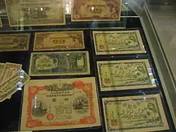 Worsened economic conditions in the following years forced the Japanese government to begin printing notes of larger denominations of 100 dollars in 1944 and 1,000 dollars in 1945.[1] The 100 dollar note was redesigned in the 1945 series to accommodate for the new 1,000 dollar note, recycling a majority of design elements from the 1944 100 dollar note. Illustration on the notes adopt more localized imagery, centering around images of rural life. The 100 and 1,000 dollar notes were the last new notes introduced before the surrender of Imperial Japan in August 1945.