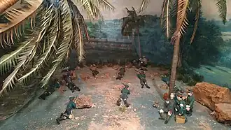 The landings by the 42nd Infantry Regiment of the IJA 5th Division led by Major Shigeharu Asaeda were made despite the rough seas and on unsuitable landing grounds.[33]The invaders were effectively opposed by the Thai 42nd Infantry Battalion, Pattani Provincial Police, and Thai Yuwachon Thahan units (the 66th Yuwachon Thahan Training Unit from Benjama Rachoothit School), until the battalion was ordered to cease fire at midday. The Thai battalion commander, Khun (ขุน) Inkhayutboriharn, was killed in action along with 23 other ranks, 5 Provincial Police, 4 Yuwachon Thahan members, and 9 civilians.[34]