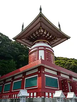 A wooden hōtō is a rare type of pagoda consisting of four parts: a low foundation stone, a cylindrical body with a rounded top, a pyramidal roof and a finial.[10] Unlike the similar tahōtō (see section below) it has no square enclosed pent roof (mokoshi) around its cylindrical core.[5] Like the tahōtō it takes its name from Buddhist deity Tahō Nyorai. The hōtō was born during the early Heian period, when the Tendai and Shingon Buddhist sects first arrived in Japan.