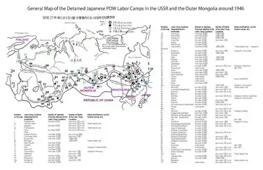 After World War II there were from 560,000 to 760,000 Japanese personnel in the Soviet Union and Mongolia interned to work in labor camps as POWs.[1] Of them, it is estimated that between 60,000[2][3][4][5] and 347,000 died in captivity.