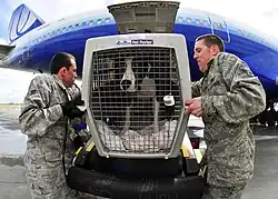 U.S. military dependent-family dog is unloaded off an evacuation flight from Japan.