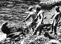 Harvest records from Japanese commercial fishermen in the early 1900s show that as many as 3,200 sea lions were harvested at the turn of the century, and overhunting caused harvest numbers to fall drastically to 300 sea lions by 1915 and to a few dozen sea lions by the 1930s. Japanese commercial harvest of Japanese sea lions ended in the 1940s when the species became virtually extinct.[18] In total, Japanese trawlers harvested as many as 16,500 sea lions, enough to cause their extinction. Submarine warfare during World War II is also believed to have contributed to their habitat destruction.[19][20] The last population survey dates from the 1950s and reported a population of only 50 to 60 animals on the Liancourt Rocks. The most recent sightings of Z. japonicus are from the 1970s, with the last confirmed record being a juvenile specimen captured in 1974 off the coast of Rebun Island, northern Hokkaido. There were a few unconfirmed sightings in 1983 and 1985.[7][19][21] In any case, it was one of the most recent marine mammal extinctions to occur, alongside the Caribbean monk seal which went extinct at around the same time.[22]