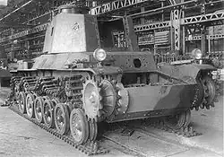 The IJA decided that the Type 87 Chi-I was too heavy and slow to be used as its main tank, so the Type 89 Chi-Ro was developed to overcome these shortcomings.[22] The new design weighed 12.8 tons and used stronger and lighter steel plate instead of the Type 87's iron armor. Armament was a Type 90 57 mm gun, along with two Type 91 6.5 mm machine guns.[23] The Type 89 prototype was completed in 1929, with production starting in 1931, making this the first tank to be mass-produced in Japan.[24] The designation is also known as the Type 89 "I-Go" and sometimes transliterated "Yi-Go".[25][26]