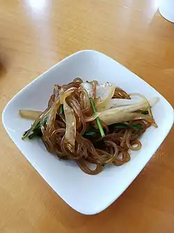 Japchae (Korean: 잡채) is a savory and slightly sweet dish of stir-fried glass noodles and vegetables that is popular in Korean cuisine.[1] Japchae is typically prepared with dangmyeon (당면; 唐麵), a type of cellophane noodles made from sweet potato starch; the noodles are mixed with assorted vegetables, meat, and mushrooms, and seasoned with soy sauce and sesame oil.[2][3][4][5]