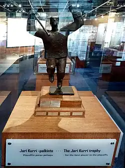 The Jari Kurri Trophy is an ice hockey trophy awarded by the Finnish Liiga to the best player in the Liiga playoffs. The trophy is named after Jari Kurri.