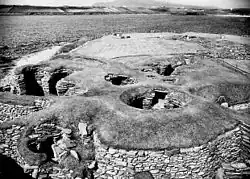 The Bronze Age in Scotland lasted from approximately 2000 BC to 800 BC.[17] The oldest known remains on the Jarlshof site date from this period, although there is evidence of inhabitation as far back as 2500 BC.[9][18] The remains of several small oval houses with thick stone walls date to the late Bronze Age and the structures show some similarity to Skara Brae on Mainland, Orkney but are smaller and of a later date. These buildings may have been partly subterranean at the earliest period of inhabitation, a technique providing both structural stability and insulation.[19]