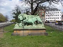 A grassy area with the ruin of Jarmer's Tower is located at the corner of H. C. Andersens Boulevard and Nørregade. A copy of Auguste Cain sculpture Lion and Lioness (French: Lion et lionne se disputant un sanglier) stands next to the ruin. As indicated by the name, it shows a lion and a lioness fighting over a wild boar. The sculpture was created in 1879 and the copy was installed at the site in 1889 as a gift from Carl Jacobsen's Albertina Foundation.[3]