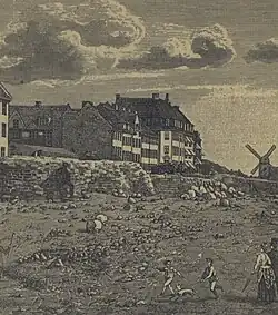 When Copenhagen's fortifications were decommissioned in the second half of the 19th century, the ramparts were leveled and the moat filled in. Jarmer's Tower was long gone but the site was excavated in connection with the Nordic Exhibition of 1888 and the remains of the tower were afterwards restored as a ruin to commemorate the city's past as a fortified city.[1]