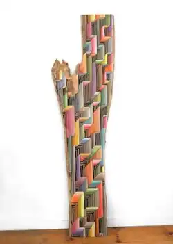 Middlebrook developed his plank sculptures after he moved to the Hudson River Valley in the mid-2000s and became fascinated by the surrounding forests and the notion of trees as records of compressed history.[6][8] A visit to a sawmill led him to consider discarded burls as substrates for paintings.[8][42] Begun in 2008,[18] the planks use totemic sections of local hardwoods—some 20 feet high—as sculptural canvasses onto which he inscribes detailed abstract patterns in glossy, vivid industrial colors.[43][7][2][6] Made of woods such as cherry, walnut, cottonwood, maple and elm—and generally leaned against the wall like John McCracken sculptures or surfboards—the planks have smooth, flat surfaces but often retain the organic shapes and craggy, bark-encrusted textures of their edges.[1][44][43][45]