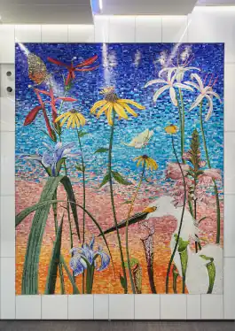 In several mosaic projects, Middlebrook extended that visual theme, exploring diverse plants and wildlife at larger-than-life scale in order to emphasize their importance to the specific regions of each commission.[5][35][36] Brooklyn Seeds (2011, MTA Brooklyn) stages a monumental garden of delicate flowers and airborne seedpods that climbs a stair wall from Avenue U to an elevated train platform; Middlebrook chose local wildflowers (burdock, goldenrod, aster, milkweed) that thrive in unlikely urban spaces like alleys, walls and cracks in sidewalks.[4][5] Growing in the Mobile Delta (2018) comprises eight vibrant glass mosaics depicting delta flowers of varying color and shape that were integrated into the classical architecture of the Mobile (Alabama) Federal Building & Courthouse lobby.[35] The immersive, 952-square-foot mosaic Florida Sunset (2021, Tampa International Airport) celebrates the area's biodiversity with oversize imagery of ten species including native flowers, insects and a snowy egret.[37][36] Middlebrook's series of 17 mosaics for the University of Nebraska Omaha's Durham Science Center (2024) focuses on the center's five disciplines (chemistry, astronomy, math, geography and geology), juxtaposing imagery of the atom, Milky Way and Golden Ratio with regional features such as Nebraska windmills and Chimney Rock.[38][39]
