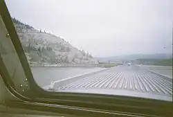 The Canadian National Railway skirts the northwestern shore of the lake. Parts it have been built on causeways away from the shore, which have created several ponds. Via Rail's passenger train the Canadian uses this same CN line for part of its journey between Toronto and Vancouver, giving passengers up-close views of the lake, sand dunes, and surrounding mountains. This area has been the site of many CN publicity photographs—including of the Super Continental[4][5]—through the years, and it is still popular with photographers, railfans, advertisers, and passengers.