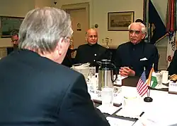He was elected on a BJP ticket to the Rajya Sabha five times (1980, 1986, 1998, 1999, 2004) and to the Lok Sabha four times (1990, 1991, 1996, 2009). During the Vajpayee administration between 1998 and 2004, he held multiple cabinet portfolios including Finance, External Affairs and Defence.[12] He also served as the Deputy Chairman of the Planning Commission between 1998 and 1999.[13] In the aftermath of India's nuclear tests of 1998, he was deputed by Prime Minister Vajpayee to act as India's representative to hold repeated, long-term dialogue with the United States (represented by Strobe Talbott) on matters related to nuclear policy and strategy; the outcome of the sustained engagement was positive for both countries.[14][15] After his party lost power in 2004, he served as Leader of Opposition in the Rajya Sabha from 2004 to 2009.[16]