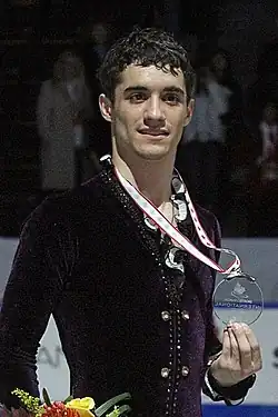 His assigned events for the 2011–12 Grand Prix season were Skate Canada and Cup of Russia. At Skate Canada, Fernández executed the only clean quadruple jump in the short program to take the lead over Daisuke Takahashi and Patrick Chan.[29] He placed second in the free skate and won the silver medal overall, exceeding his combined total personal best by over thirty points. He became the first Spanish skater to win a Grand Prix medal.[3] At the Cup of Russia, he placed fourth in the short program, first in the free skate, and finished second overall with an overall total of 241.63 points — only 0.03 behind gold medalist Yuzuru Hanyu of Japan.[30] Fernández became the first Spanish skater to ever qualify for the Grand Prix of Figure Skating Final when he qualified for the 2011–12 event. In Quebec City, he was third in the short program and fourth in the long to win the bronze medal, and in so doing, became the first Spaniard to medal at a Grand Prix Final.[31][32][33] Fernández reclaimed his national title, winning by over eighty points.[34]