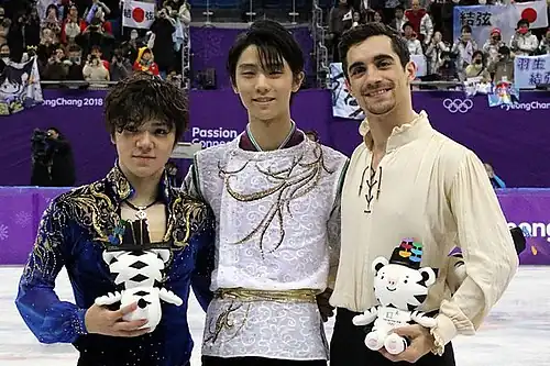 At the 2018 Winter Olympics, Fernández skated his "Modern Times" short program, executing a quad-triple toe loop combination, a quad Salchow, a triple Axel and all level 4 elements. He received nine perfect 10.00 scores in program components and received 107.58 points,[108] placing him second in that segment behind defending champion Yuzuru Hanyu.[109] In the free skate, Fernández landed a quad toe loop, a quad Salchow in combination, two triple Axels and five more triples, and earned four perfect 10.00 component marks. His only major mistake was popping a planned second quad Salchow into a double. His free skate performance earned 197.66 points [110] and a total competition score of 305.24[111] – both season's best for him. Fernández won the bronze medal behind Japan's Hanyu and Shoma Uno, the first ever figure skating Olympic medal for Spain.[112] In the figure skating gala, Fernández performed his aerobics class exhibition program wearing in a "Super Javi" Spanish-colored Superman costume.; the program included parodies of Flashdance and iconic 1980's workout jams.[113][114]