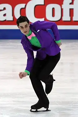 Fernández started his season at the 2012 Finlandia Trophy[37] where he won the bronze medal. His first Grand Prix event of the season was Skate Canada, where he beat defending Skate Canada and World champion, Patrick Chan, to take the gold medal. Fernández became the first Spaniard to win a gold medal in the Grand Prix series. Despite his fourth place at the 2012 NHK Trophy, he qualified for the Grand Prix Final. He finished fourth overall at the final after winning the free program with a 4S-3T jump combination, 4S, and 4T.[38] He became the second European to execute three quads in one program — the first being Brian Joubert who landed a 4T-2T combination, 4T, and 4S at the 2006 Cup of Russia[39] — and the first European to do so with a quad-triple combination.